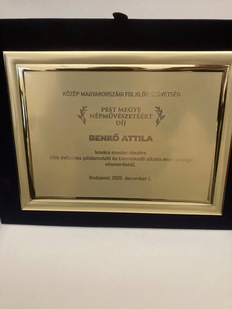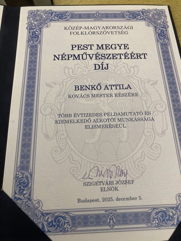 Egyesületünk kovácsa, Benkő Attila a Közép-Magyarországi Folklórszövetségtől a Pest Megye Népművészetéért Díját kapta meg a több évtizedes kitartó és példamutató munkásságáért.