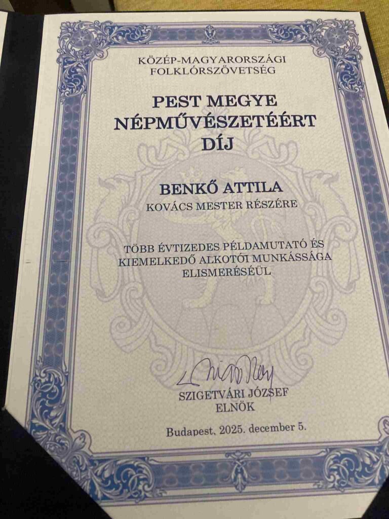 Pest Megye Népművészetéért díjat kapott Benkő Attila kovácsmesterünk, melyre alkotónkat a Közép-magyarországi Folklórszövetség terjesztette föl. A díjat december 5-én, a Megyeháza pompás Dísztermében adták át.