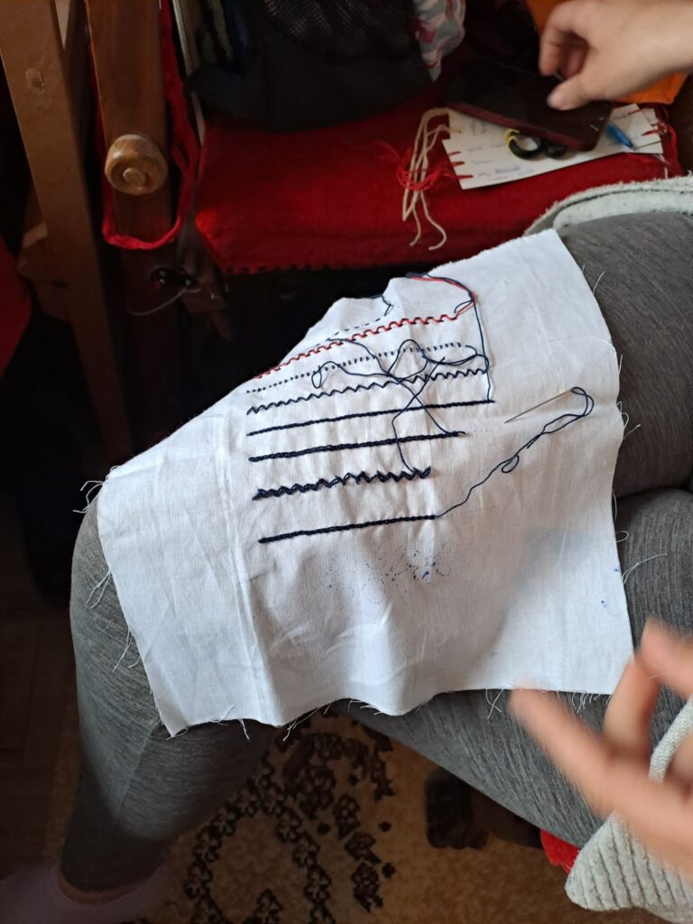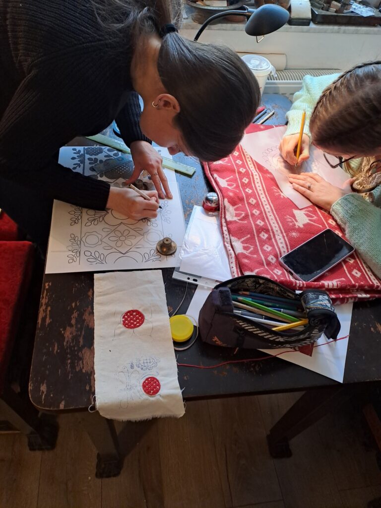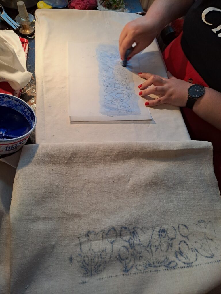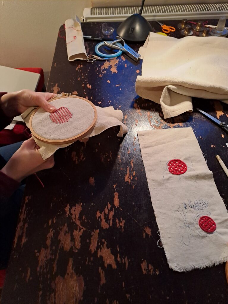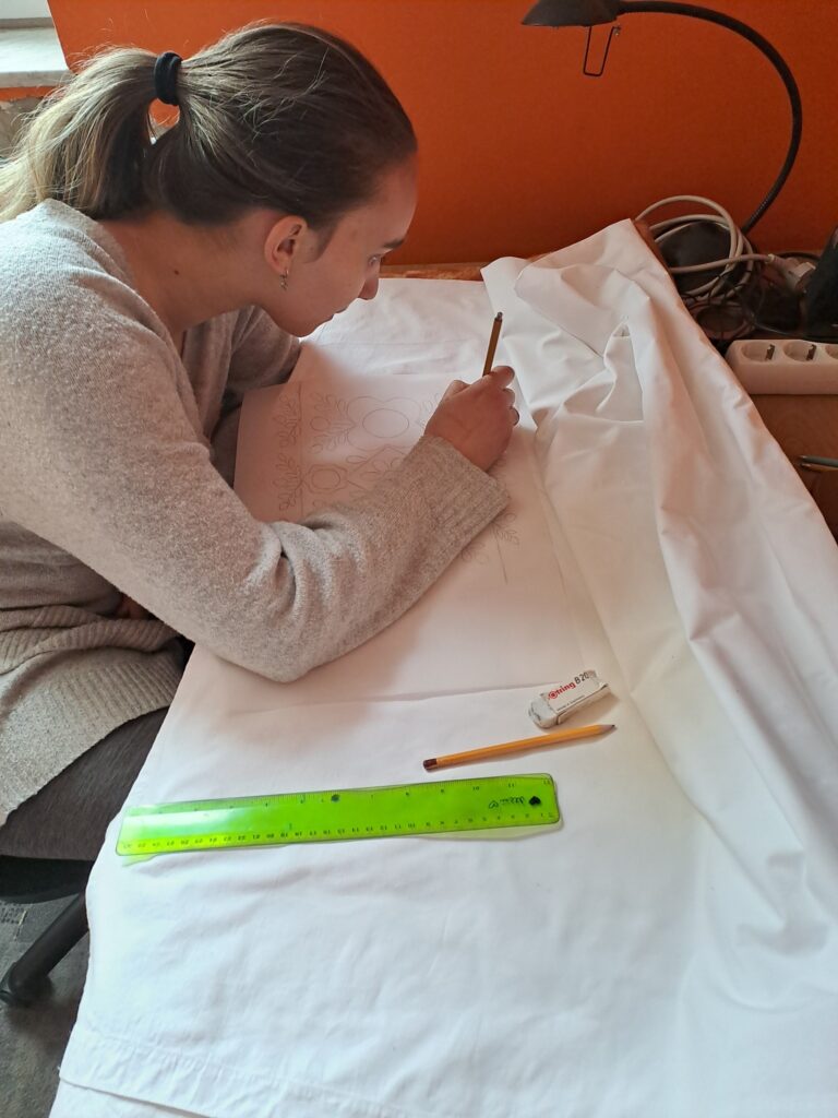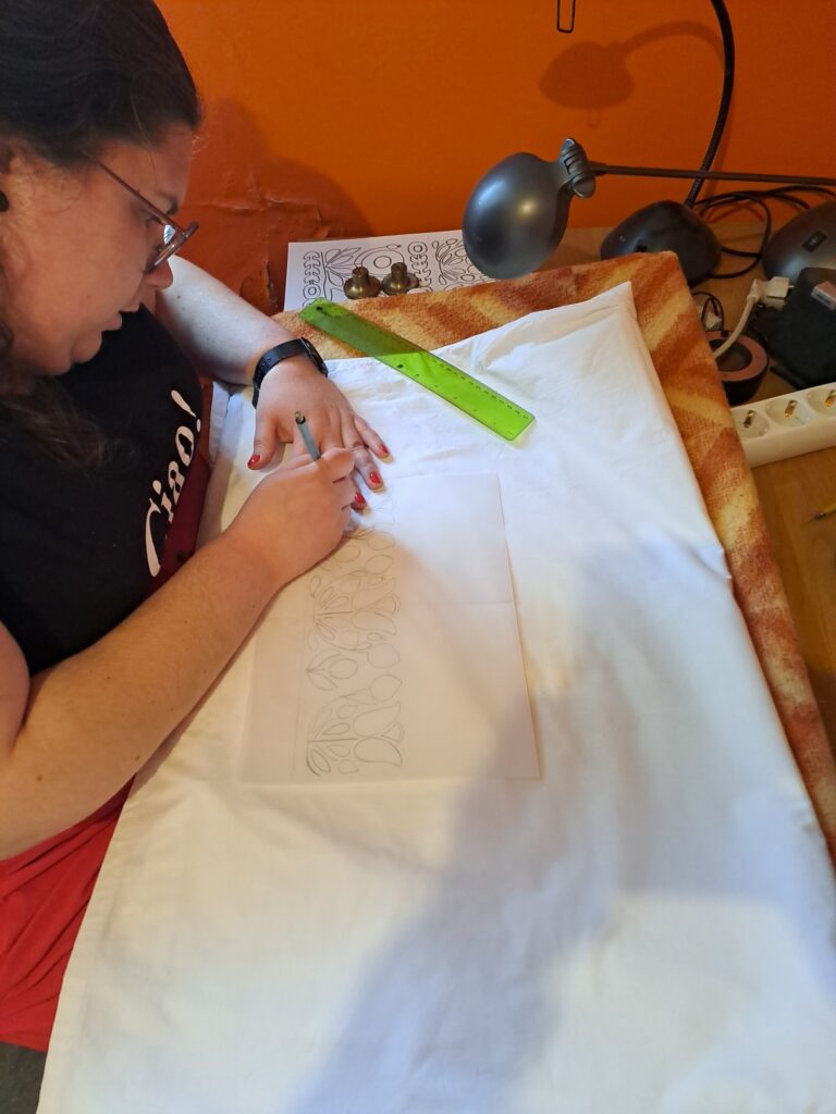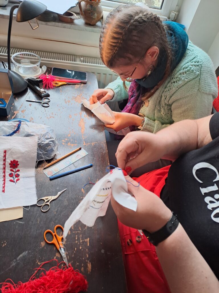 A programban részt vevő Inasok közül hárman teljesen kezdők, most ismerkednek a népi hímzésekkel, az öltéstechnika alapjaival.