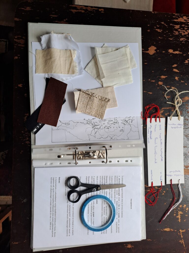 Az első foglalkozás „elméleti óra” volt, melynek témái: népviseletek csoportjai, jellegzetességei színek jelentősége, viseletek korcsoportok és tájegységek szerint, alapanyagokkal való ismerkedés, hogyan kezdjünk hozzá egy tájegység vagy falu viseletének feldolgozásához, mi a különbség a színpadi jelmez a rekonstrukció vagy a stilizált viselet között. A foglalkozás második részében az anyagismerettel foglalkoztak a résztvevők. Ezen belül anyagismereti táblák készítésével kezdtük, mely a dokumentáció része. Majd egy mintakendőn az alapöltéseket gyakoroltuk. A foglalkozás második részében a széki hímzéssel ismerkedtünk, választottak mintát a dokumentációs mappára készülő borítóra, melynek a sablonját is ők készítették el. Ezt követően a kiválasztott hímzőfonállal elkezdték a hímzést, melyet otthon fejeznek be.
