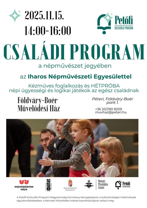 2025. november 15-én 14:00-16:00 óra között egy izgalmas programra hívjuk szeretettel a családokat a művelődési házba. „Családi program a népművészet jegyében” című eseményen az Iharos Népművészeti Egyesület tagjaival találkozhatnak, játszhatnak együtt!